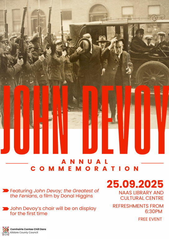 This annual event, organised by the Friends of John Devoy, is held to commemorate the renowned Fenian in the county of his birth. The event will be opened by the Cathaoirleach of the County of Kildare, Cllr. Carmel Kelly, with guest speaker, Frank MacGabhann whose aunt, Alice, donated Devoy’s papers to the National Library of Ireland in 1938. She revealed to Frank that she was among the few individuals Devoy had confided in about the 1916 Rising beforehand. A short film by Donal Higgins, John Devoy: the Greatest of the Fenians, will also be shown.